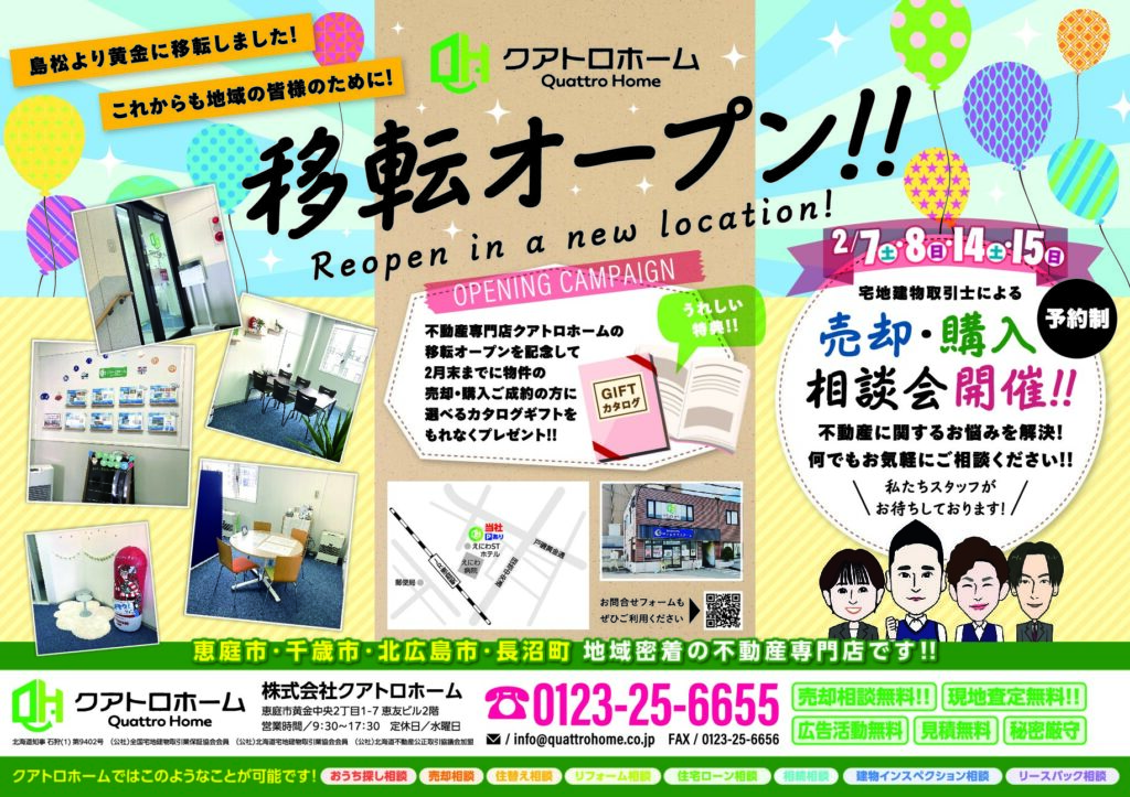 – 恵庭・北広島・長沼・千歳エリア – 不動産の購入・売却ならクアトロホームへお任せください new Properties 新着物件 戸建て 黄金中央2丁目 戸建て 3,700万円 4SLDK / 売戸建住宅 恵庭駅 徒歩6分 戸建て 恵庭市駒場町3丁目 戸建 1,600万円 3LDK / 売戸建住宅 恵庭駅(徒歩28分) 戸建て 黄金中央2丁目 戸建 2,000万円 3LDK / 売戸建住宅 恵庭駅(徒歩5分) マンション 日新プリンスハイツ 部屋番号:407 748万円 3LDK / 売戸建住宅 JR糸井駅(徒歩約22分) 戸建て 恵庭市島松旭町二丁目 戸建 3LDK 3,800万円 3LDK / 売戸建住宅 JR千歳線島松徒歩15分 戸建て 恵み野東6丁目 2世帯住宅+事務所 3,380万円 7LDK / 売戸建住宅 JR千歳線「恵み野」 徒歩約27分 土地 千歳市錦町4丁目 土地 4,000万円 226.53㎡㎡ / 売地 JR千歳線 「千歳」駅 徒歩約17分 戸建て 恵庭市島松東町3丁目 戸建て 3,800万円 3SLDK / 売戸建住宅 JR千歳線「島松」徒歩11分,JR千歳線 「恵み野」 徒歩26分 新着物件一覧 About Quattro Home クアトロホームとは 詳しく見る about Quattro Home クアトロホームとは 詳しく見る Purchase 購入をご検討の方へ 詳しく見る Sale 売却をご検討の方へ 詳しく見る \クリックで拡大!/ 最 新 の チ ラ シ 情 報 news お知らせ お知らせ2026.01.161/17(土)、1/18(日) オープンハウス開催!お知らせ2025.12.21年末年始休業のお知らせお知らせ2025.12.13新事務所のご案内お知らせ2025.07.31HPリニューアルのお知らせ 一覧をみる information 不動産お役立ち情報 不動産お役立ち情報2026.02.09「札幌・千歳と比較して判明!恵庭市が『住みここちランキング』で選ばれ続ける3つの理由」不動産お役立ち情報2025.12.14不動産を相続したらなにをする?売却の際に覚えておきたいポイント不動産お役立ち情報2025.12.14不動産売却で負う契約不適合責任とは?不動産お役立ち情報2025.12.14不動産売却における査定方法は2種類! 一覧をみる