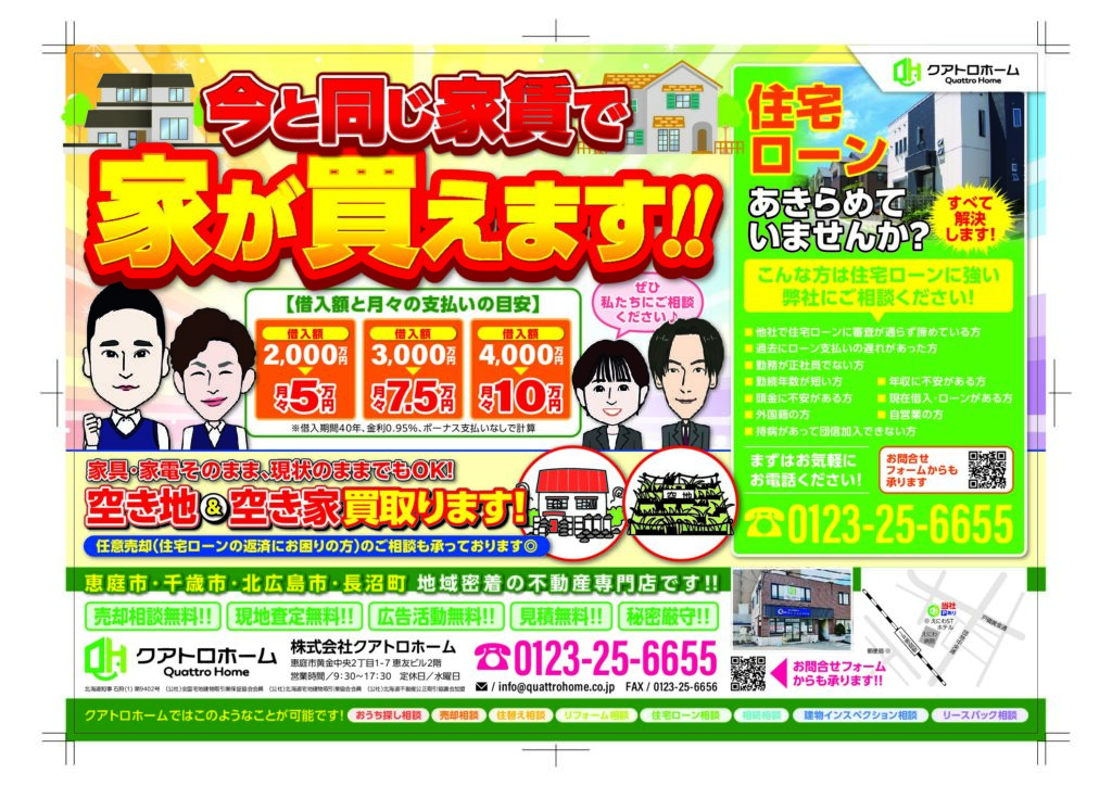 – 恵庭・北広島・長沼・千歳エリア – 不動産の購入・売却ならクアトロホームへお任せください new Properties 新着物件 戸建て 黄金中央2丁目 戸建て 3,700万円 4SLDK / 売戸建住宅 恵庭駅 徒歩6分 戸建て 恵庭市駒場町3丁目 戸建 1,600万円 3LDK / 売戸建住宅 恵庭駅(徒歩28分) 戸建て 黄金中央2丁目 戸建 2,000万円 3LDK / 売戸建住宅 恵庭駅(徒歩5分) 成約済み マンション 日新プリンスハイツ 部屋番号:407 3LDK / 売戸建住宅 JR糸井駅(徒歩約22分) 戸建て 恵庭市島松旭町二丁目 戸建 3LDK 3,800万円 3LDK / 売戸建住宅 JR千歳線島松徒歩15分 戸建て 恵み野東6丁目 2世帯住宅+事務所 3,380万円 7LDK / 売戸建住宅 JR千歳線「恵み野」 徒歩約27分 土地 千歳市錦町4丁目 土地 4,000万円 226.53㎡㎡ / 売地 JR千歳線 「千歳」駅 徒歩約17分 戸建て 恵庭市島松東町3丁目 戸建て 3,800万円 3SLDK / 売戸建住宅 JR千歳線「島松」徒歩11分,JR千歳線 「恵み野」 徒歩26分 新着物件一覧 About Quattro Home クアトロホームとは 詳しく見る about Quattro Home クアトロホームとは 詳しく見る Purchase 購入をご検討の方へ 詳しく見る Sale 売却をご検討の方へ 詳しく見る \クリックで拡大!/ 最 新 の チ ラ シ 情 報 news お知らせ お知らせ2026.01.161/17(土)、1/18(日) オープンハウス開催!お知らせ2025.12.21年末年始休業のお知らせお知らせ2025.12.13新事務所のご案内お知らせ2025.07.31HPリニューアルのお知らせ 一覧をみる information 不動産お役立ち情報 不動産お役立ち情報2026.02.23【2026年最新】恵庭・千歳エリアの地価はどう動く?「今」が売りどき・買いどきと言える理由不動産お役立ち情報2026.02.09「札幌・千歳と比較して判明!恵庭市が『住みここちランキング』で選ばれ続ける3つの理由」不動産お役立ち情報2025.12.14不動産を相続したらなにをする?売却の際に覚えておきたいポイント不動産お役立ち情報2025.12.14不動産売却で負う契約不適合責任とは? 一覧をみる