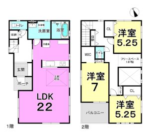| 間取り(内訳) | 1階:LDK22帖 / 2階:洋室7帖 洋室5.25帖 洋室5.25帖 | 建物面積 | 104.12㎡ |