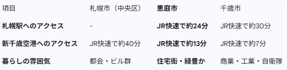 千歳と比較して: 千歳は現在、工事関係者やビジネス需要で非常に活気がありますが、恵庭は「居住専用の落ち着いた住宅地」としての性格が強く、静かに暮らしたい層に支持されています。